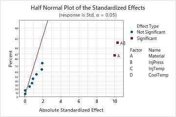 Use the half normal probability plot of the effects to determine the magnitude and the importance of the effects. On the half normal probability plot of the effects, effects that are further from 0 are statistically significant. The color and shape of the points differ between statistically significant and statistically insignificant effects. For example, on this plot, the effects for A and AB are statistically significant at the 0.05 level. These points have a different color and shape from the points for the insignificant effects. Also, Minitab puts labels on the statistically significant points.