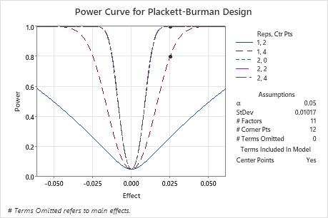 In these results, Minitab calculates the number of replicates to achieve a target power of at least 0.8 or 0.9 for an effect size of 0.025. The designed experiment has 12 corner points to study 11 factors. The calculations consider designed experiments with 0, 2, or 4 center points. The curve that shows 1 replicate with 4 center points has a symbol for the effect of 0.25 where the power is higher than the target power of 0.8. The 3 curves that represent experiments with 2 replicates have symbols that show that the power to detect an effect of 0.025 is larger than the target power of 0.9.