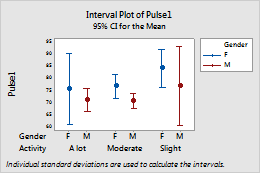 For example, the symbols and interval bars in the following interval plot are different colors for the different levels of the Gender variable.