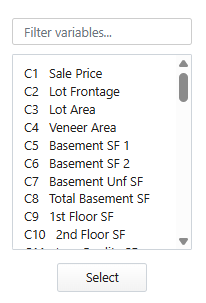 The column list in this dialog includes 78 columns. Enter text in the Filter variables box to filter the list of variables by name.