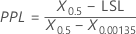 PPL is calculated using the parameter values that you specify or is estimated using maximum likelihood method for a distribution used in the analysis. Minitab calculates the PPL statistic using either the Z-Score method (default) or the ISO method, depending on the settings that are selected in . The following formulas are based on the default tolerance of K = 6, which is 6 standard deviations wide (3 standard deviations on each side of the process mean).