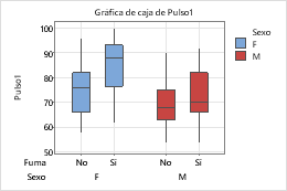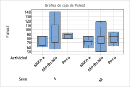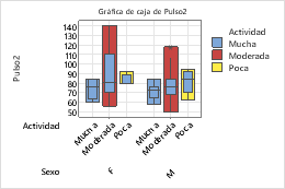 Los siguientes pasos describen cómo diferentes atributos a una variable de agrupación en una gráfica de caja, que contiene cajas de rango intercuartil (IQR) y cajas de rango.