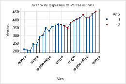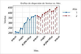 Minitab ofrece varias formas de mostrar grupos en una gráfica; sin embargo, no todas las opciones están disponibles para todas las gráficas u organizaciones de hoja de trabajo.