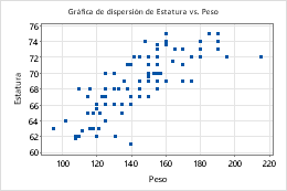 Puede representar diferentes grupos en una gráfica, de manera que pueda comparar grupos fácilmente. Por ejemplo, puede presentar una gráfica de dispersión de Peso vs. Altura para mujeres y Peso vs. Altura para hombres.