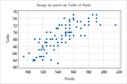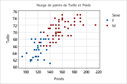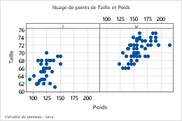 Vous pouvez représenter différents groupes sur un graphique afin de les comparer facilement. Par exemple, vous pouvez créer un nuage de points de Poids en fonction de Taille pour les femmes et de Poids en fonction de Taille pour les hommes.