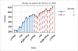 Minitab propose plusieurs méthodes pour afficher des groupes sur votre graphique ; toutefois, toutes les options ne sont pas disponibles pour tous les graphiques ou agencements dans la feuille de travail.