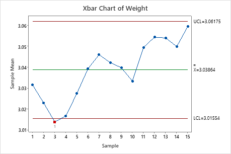 Red points indicate subgroups that fail at least one of the tests for special causes and are not in control. If the same point fails multiple tests, then the point is labeled with the lowest test number to avoid cluttering the graph. If the chart shows out-of-control points, investigate those points.
