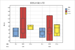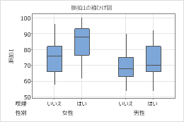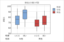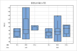 以下の手順では、箱ひげ図で属性をグループ化変数と区別する方法が説明されています。箱ひげ図には四分位間範囲(IQR)ボックスや範囲ボックスが含まれます。