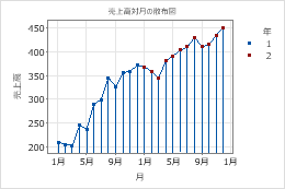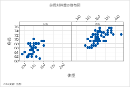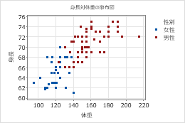 グラフ上に異なるグループを表示することによって簡単にグループを比較できます。たとえば、女性の体重と 身長、男性の体重と 身長の散布図を作成できます。