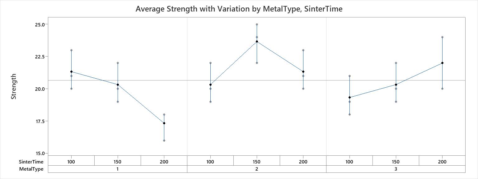The first chart is the average response with variation chart that shows the strength measurement values and the range of each cell that is formed by the combination of the two factors–MetalType and SinterTime. The second chart shows the standard deviation for each combination of the two factors.