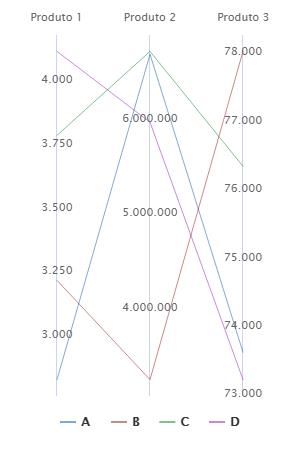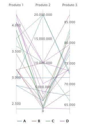 Crie um gráfico paralelo que exibe uma série para cada linha da worksheet e usa a mesma cor para cada nível de variável de agrupamento. A worksheet deve incluir pelo menos duas colunas de dados numéricos e uma coluna que contém os grupos.