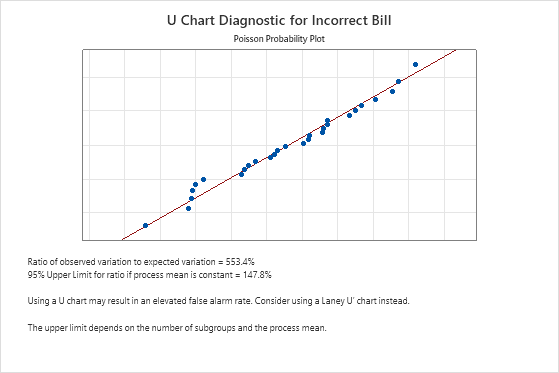 The ratio of observed variation to expected variation is 553.4%. This value indicates overdispersion because it is greater than the upper confidence limit of 147.8%. Overdispersion can cause points on a traditional U chart to appear to be out of control when they are not. To adjust for overdispersion, use a Laney U' chart.