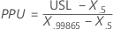 可以使用您指定的参数值计算 PPU,也可以使用分析中所用分布的极大似然法估算 PPU。Minitab 使用Z 值法(默认)或ISO 方法估算 PPU 统计量,具体方法取决于在中选择的设置。以下公式基于 K = 6 的默认公差,公差宽度是 6 个标准差(过程均值的每一侧有 3 个标准差)。